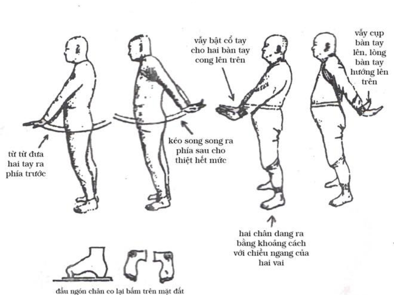 Chuyển động chính của bài tập là động tác vẩy tay: đứng thẳng, hai chân rộng bằng vai, hai tay buông tự nhiên và vẩy ra sau mạnh, ra trước nhẹ, đều đặn khoảng 300 đến 1000 lần mỗi ngày. Khi luyện tập, người tập cần giữ tinh thần an tĩnh, không bị phân tán bởi suy nghĩ hay môi trường xung quanh.